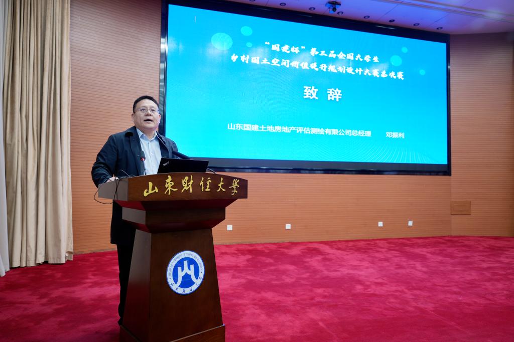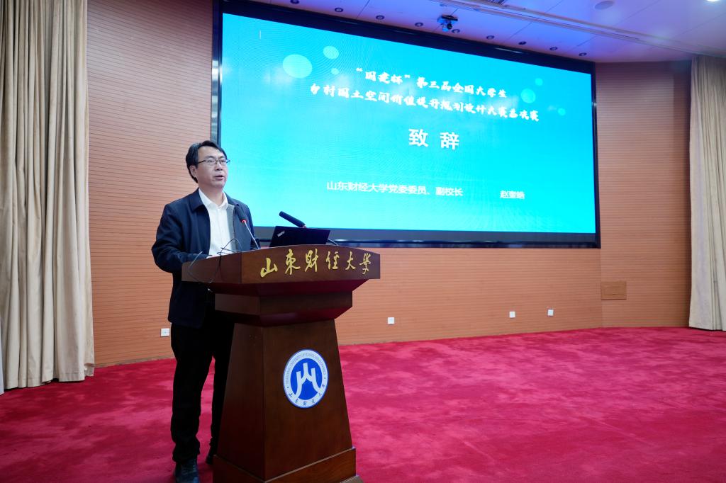 、山东国建土地房地产评估测绘有限公司协办。本届大赛自2024年11月启动以来,吸引了全国11个赛区70余所高校、300余支队伍参加,历经省赛选拔、预评及网络投票等环节,56支优秀团队脱颖而出,晋级全国总决赛。来自中国国土经济学会、中国土地学会、中国城市规划学会以及北京师范大学、东北师范大学等高校专家学者,学校党政办公室、党委宣传部、教务处、校团委负责人参加。
