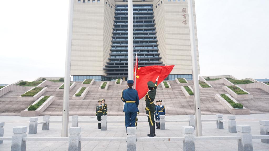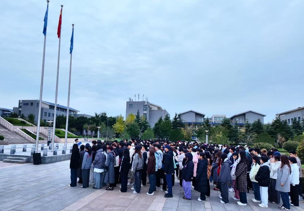 在章丘校区图书馆北侧广场举行升国旗仪式。